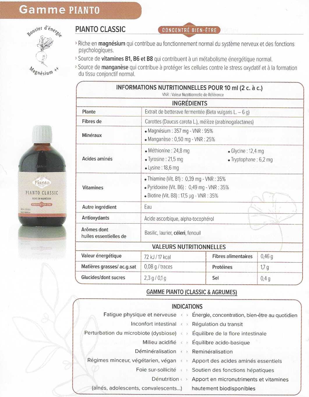 Le Pianto Classic est un complément alimentaire, concentré de betterave fermentée, d’extraits de végétaux, de vitamines , riche en magnésium hautement biodisponible, qui apporte un grand nombre de micronutriments et source d’acides aminés essentiels, pour un bien-être quotidien.
