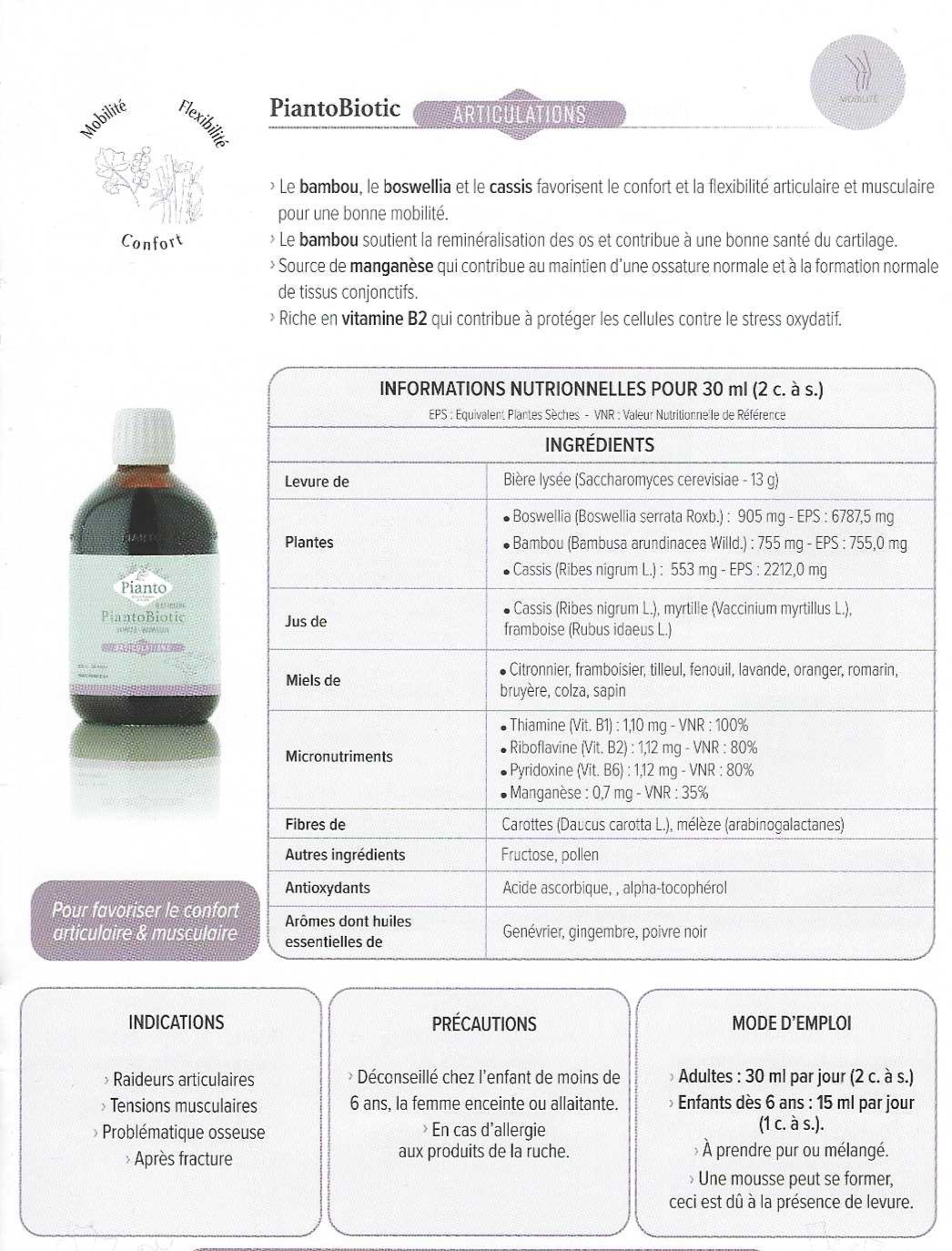 Le PiantoBiotic (Ex B.St-Joseph) Articulations, est un concentré fermenté par la levure lysée , enrichi de bambou , boswellia et cassis et riche en vitamine B 2 dont la synergie d’action améliore naturellement la mobilité.