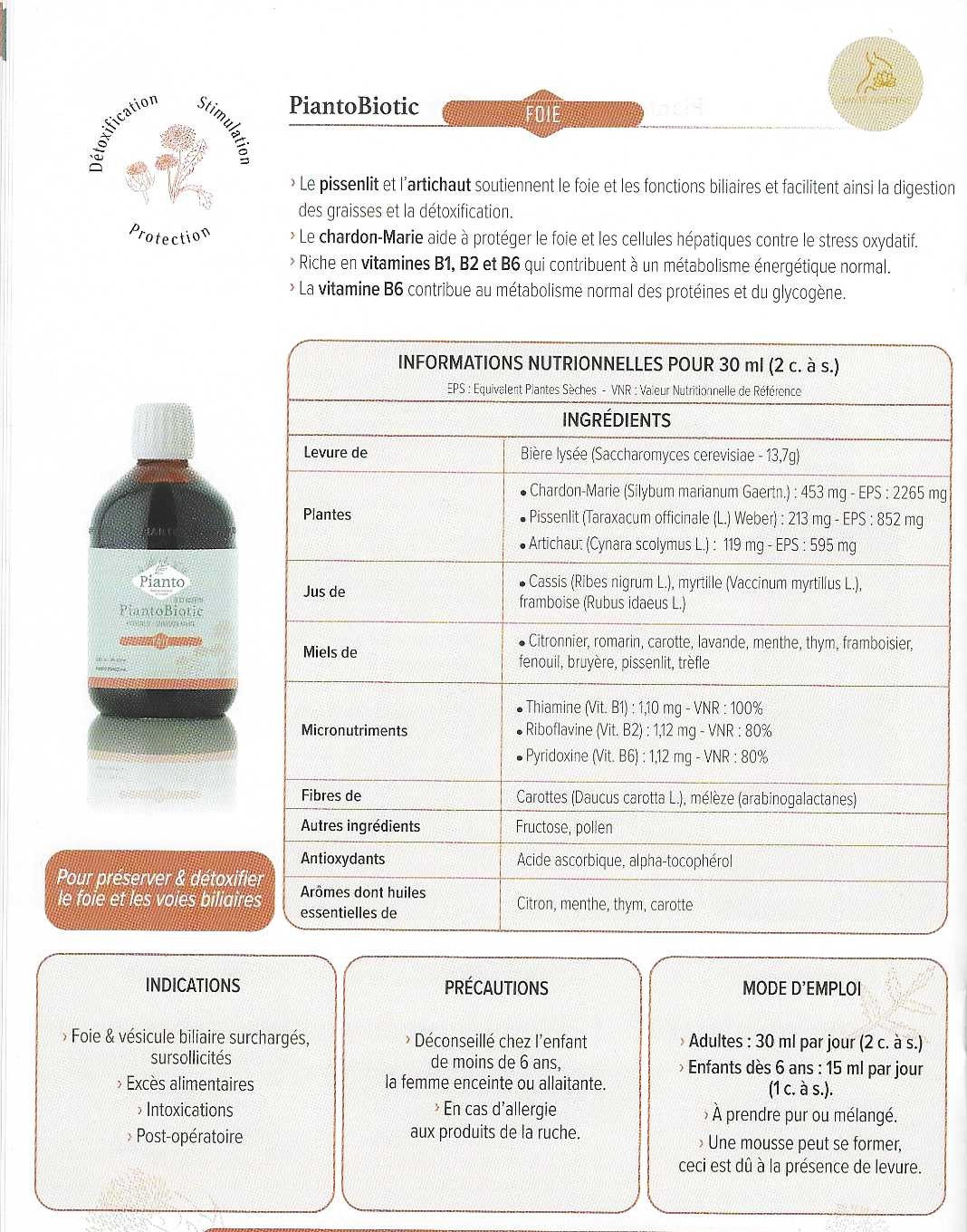 Le PiantoBiotic (Ex B.St-Joseph) Foie est un concentré fermenté par la levure lysée, enrichi de pissenlit, chardon-Marie, artichaut, miels et vitamines B1, B2 et B6 .